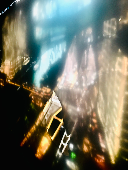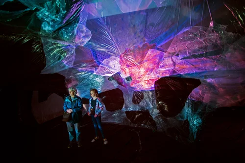 Recycled plastic sheeting, milk cartons, water bottles, PET purge scraps, speakers, sound recording, 4 projectors, video animations of Blaschka glass models, industrial fan